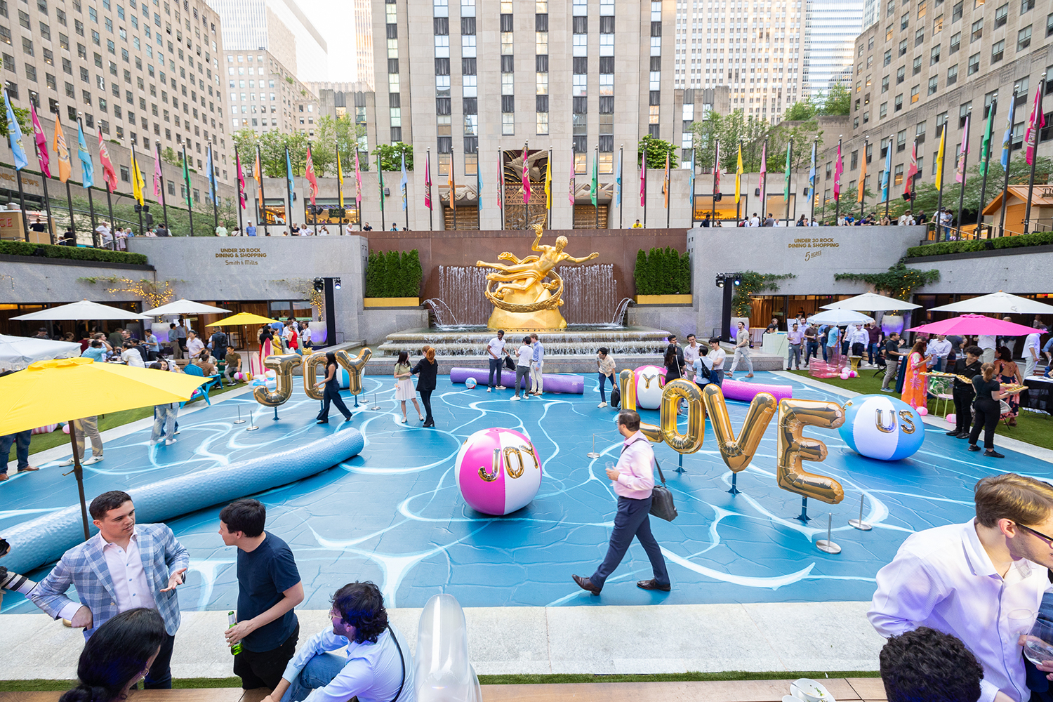 A summer soiree surrounding an art exhibit at Rockefeller Plaza, where colleagues are invited to connect outside of the office.