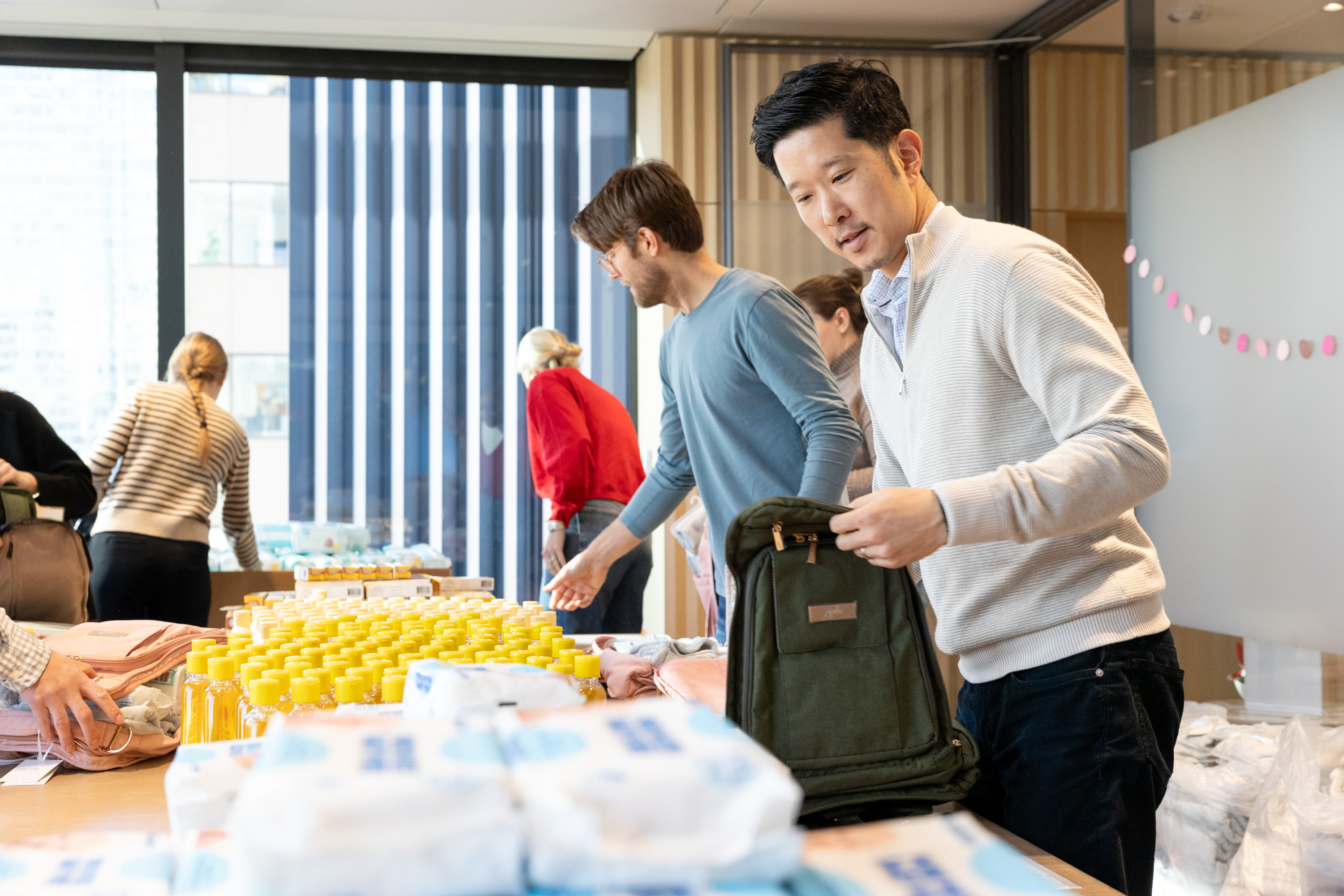 Surveyor Capital team members volunteer in a packing event for Baby2Baby.