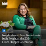 We recently hosted chess grandmaster Judit Polgár to speak with women in STEM at the Grace Hopper Celebration. She shared her insights on self-confidence and the importance of learning from setbacks. Judit also masterfully played four rounds of chess simultaneously with attendees.
